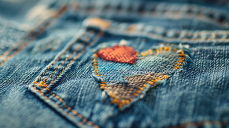 Close-up of denim fabric with heart-shaped patch stitched on