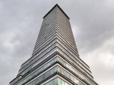 Skyscraper in Barcelona surrounded by clouds and dark sky in the background