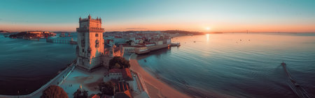 A beautiful view of a city with a tall tower in the background. The tower is surrounded by a sandy beach and the water is calm. The sky is a mix of orange and blue hues, creating a serene