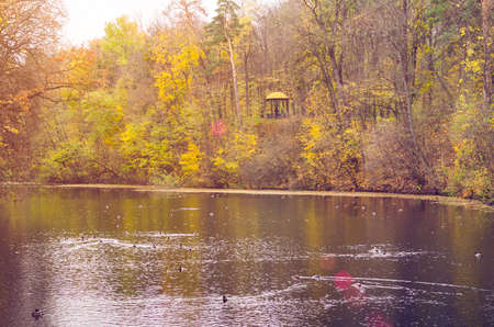 Autumn landscape with lake and trees. Photo in retro style.
