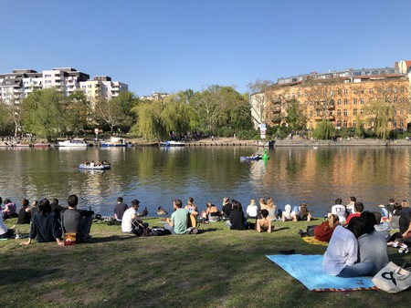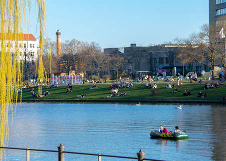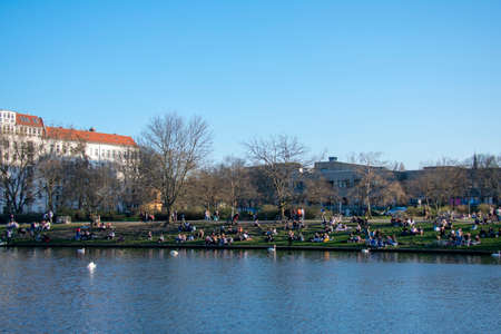 Berlin, Germany - april 2019: People enjoying sunny weather on the street, sitting at riverside in Berlin, Kreuzberg during spring