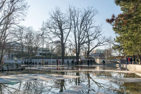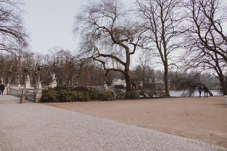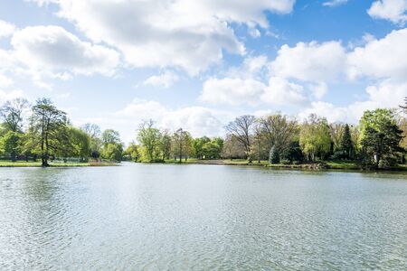 Landscape with old green trees near Herastrau lake and large green trees in King Michael I Park (former Herastrau) in Bucharest, Romania, in a sunny spring day