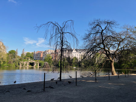 Scenic urban park with bare trees by a calm lake, birds on the shore, and historic buildings in the background under a clear blue sky.