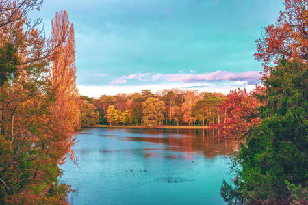 Autumn lake reflection and forest at sunset. Vibrant fall landscape with tranquil lake reflecting colorful foliage of trees under dramatic blue sky, serene and picturesque scenic