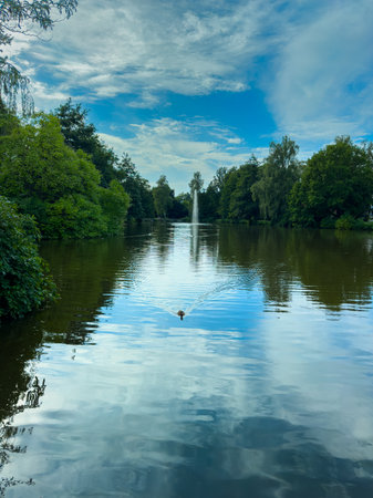 Picture a serene lake with lush greenery, a charming fountain, and clouds reflecting on the water under a clear blue sky, perfect for nature lovers and relaxation