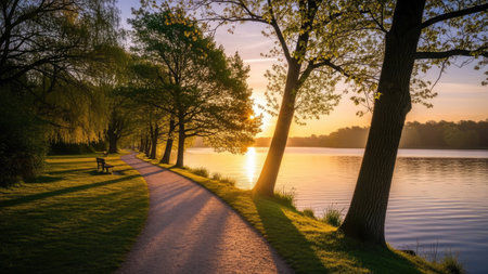 A pathway meanders along a tranquil lake at sunset. Tall trees frame the scene, illuminated by warm sunlight. The composition features a grassy verge and the serene water. This image could be used for various projects needing a backdrop, or representing themes such as nature, peace, and travel.