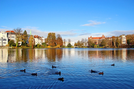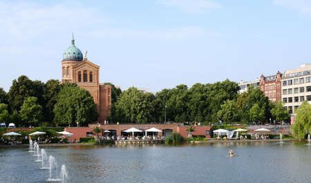 Beautiful landscape with lake and green trees in April in front of the City hall of Hannover, Germany.