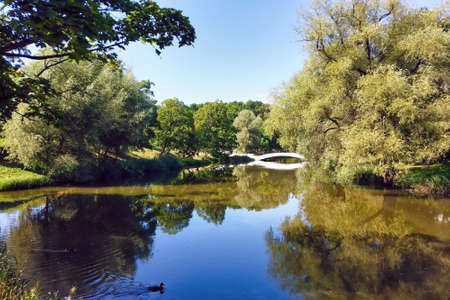 City park with old lush green trees and pedestrian bridge reflected in calm mirror water surface of small pond in Kaliningrad, Russia at sunny day. With no people summer landscape.