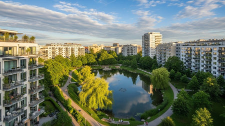 Aerial view of a modern residential complex with a central pond surrounded by lush green trees.