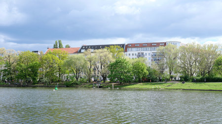 Berlin, Germany, April 19, 2024, View across the Urbanhafen to the facade of the residential buildings on the Planufer