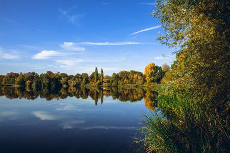 Reflection of autumn trees in the lake. Beautiful autumn landscape on the lake. Beautiful autumn landscape.