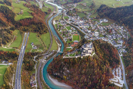 Aerial view of the small cozy german town at the mountain bottom at sunrise in a winter season, Halblech city, Germany, Bavaria, Branches of trees are covered with hoarfrost, sunny weather