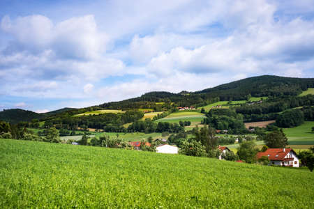 Aerial view from lookout U Jakuba to czech landscape known as Czech Canada. Touristic place. View to forest, field, meadows and small village in sunny day with blue sky