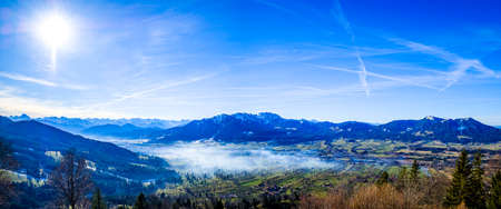 Aerial panoramic landscape of Upper Bavarian foggy foothills with morning sunrise over Alps mountains