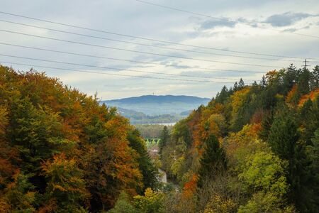 Austrian landscape with forests, fields, pastures and meadows on the background of green hill. Vintage style