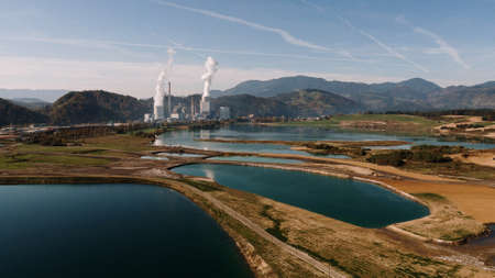 An aerial shot of a landscape surrounded by mountains and lakes with industrial disaster