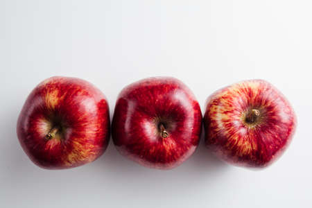 Three red juicy apples on white table. Space for text