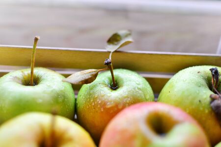 Juicy ripe apples. Red-green apples are neatly stacked in a row. Fruits in a wooden box.