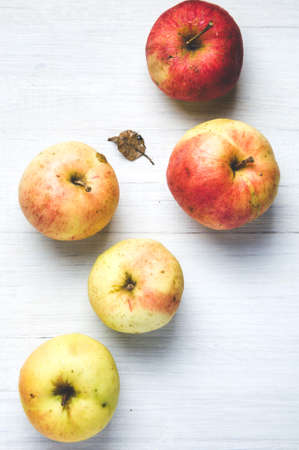 Ripe and juicy red apples on a vintage table. Food background.