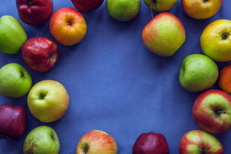 Ripe apples on blue background, space for text