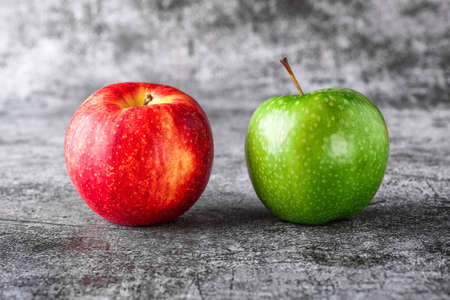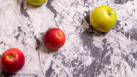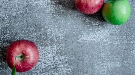 Gray concrete background, , red and green apples view from the top. Place for an inscription, New Year, in the style of health.
