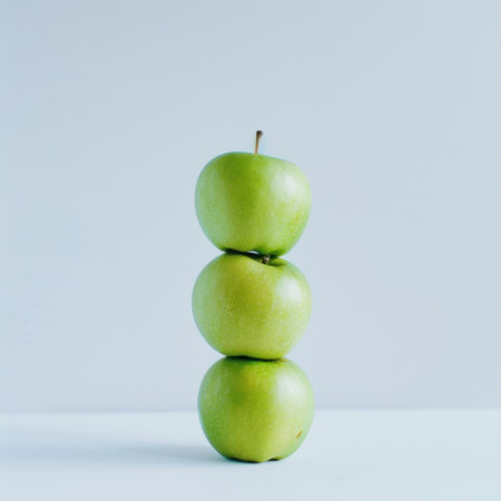 A visually appealing arrangement of three fresh green apples stacked vertically against a soft light background, perfect for promoting healthy eating and minimalist aesthetics.