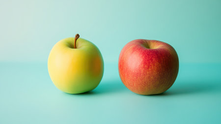 Two apples rest on a mint green surface showcasing a vibrant green apple and a red apple side by side highlighting their color contrast.