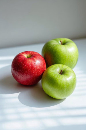 Close up of a still life with red and green apples