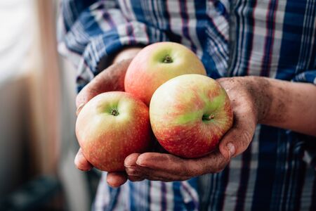 Farmers hand holding fresh and ripe apples from new harvest.