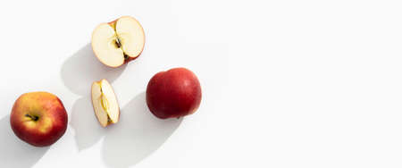 Whole, halves and cut apples on a white background. Top view, flat lay. Banner.
