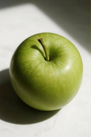 Green apple on a white background with a shadow from the sun.