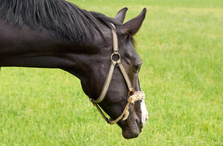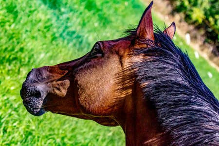 Brown horse posing on the green meadow summertime. Head shot closeup of a purebred young horse on summer pasture. Closeup of a young domestic horse on natural green background outdoors.