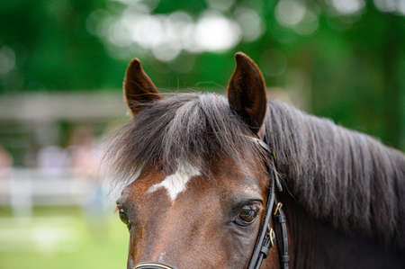 Portrait close up of showjumper horse at equestrian show jumping during competition event. Photo shot of a beautiful show jumper horse on natural background