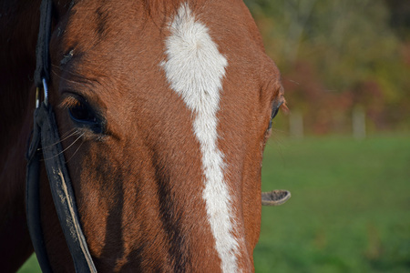 Brown horse standing in snow covered field, blurred trees background, detail on head.