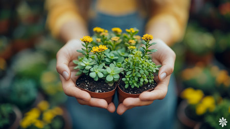 A close-up of hands holding a small potted plant with vibrant yellow flowers, symbolizing care, growth, and natural beauty.