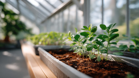 A serene greenhouse filled with young plants growing in rich soil under natural light, creating an atmosphere of freshness and vitality.