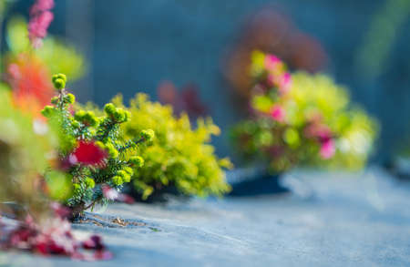 Close-up, ornamental plants for home decor on a shop window.