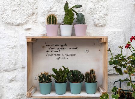 Variety of cactus and succulent growth in pot on wooden shelf in shop. Small plant for home or office.
