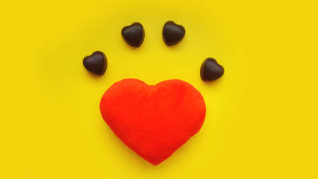 Valentines day background with soft toy heart and chocolates on yellow background. Top view. For banner, cards design