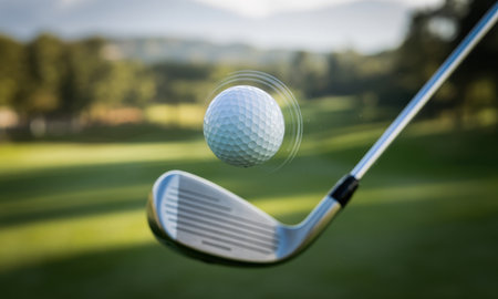 White golf ball captured in mid air with motion blur, milliseconds after being struck by a golf club on a vibrant green golf course, illustrating power and precision in sport.