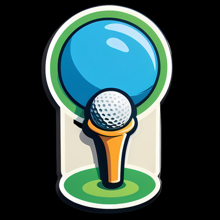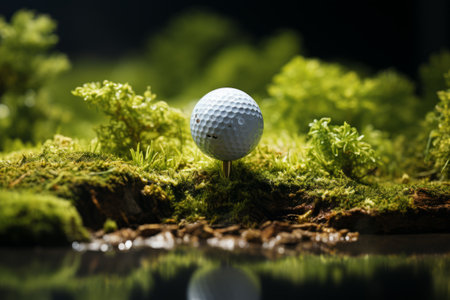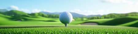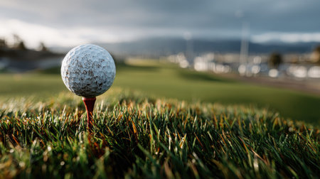 A golf ball poised on a tee with a club in position to strike, surrounded by lush green grass and a vibrant outdoor scene, perfect for sports enthusiasts.