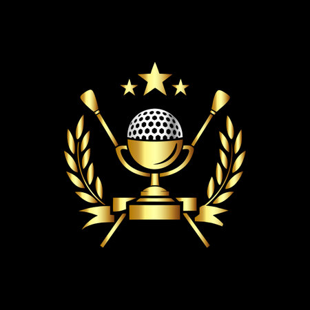 Golf club emblem. Golden award cup with crossed clubs and stars.