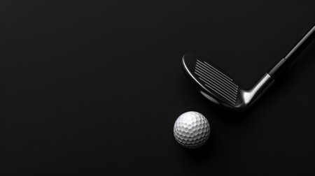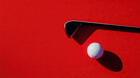 A striking close-up image featuring a golf club and a white golf ball against a vibrant red background, perfect for sports and leisure themes.