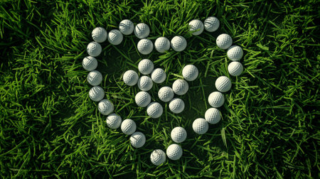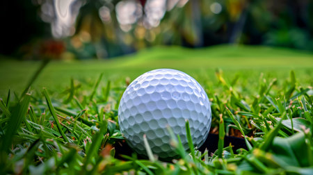 A close-up view of a golf ball resting on vibrant green grass, capturing the essence of outdoor sports and leisure activities in a serene environment.