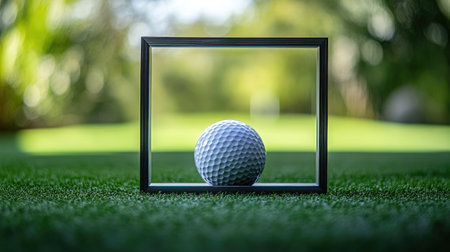 A golf ball in a sleek frame, with a blurred green in the background, perfect for commemorating a hole