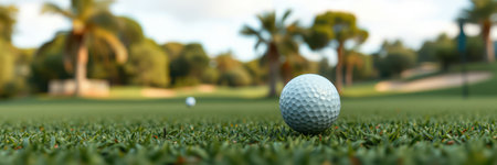 Golf ball resting on green grass with palm trees in the background at a sunny day in a coastal golf course