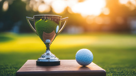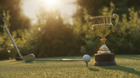 A golf trophy and club are placed on a lush green golf course, bathed in warm sunlight.