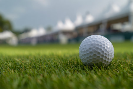 A stunning close-up view of a single golf ball resting on vibrant green grass, set against a picturesque golf course landscape under soft natural light.