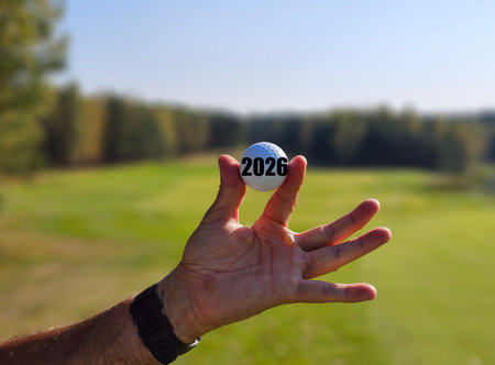 Holding a golf ball marked 2026 on a sunny day at the golf course