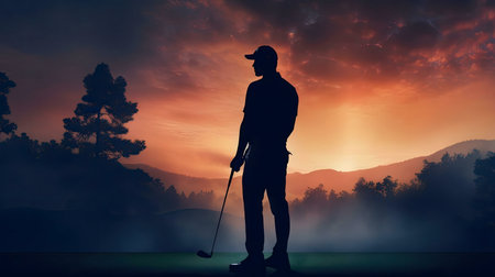 Silhouette of a golfer enjoying a sunset on a golf course.